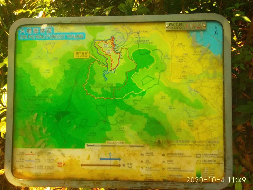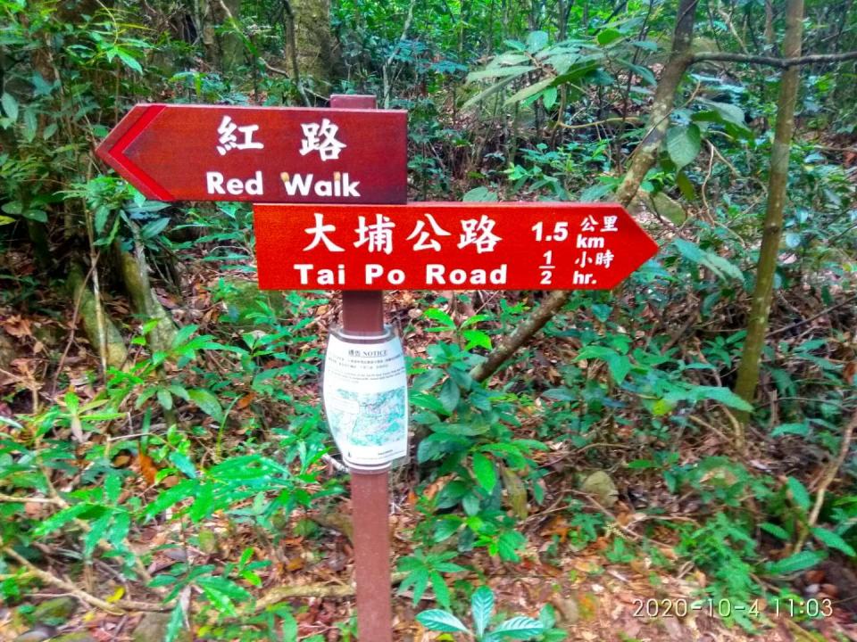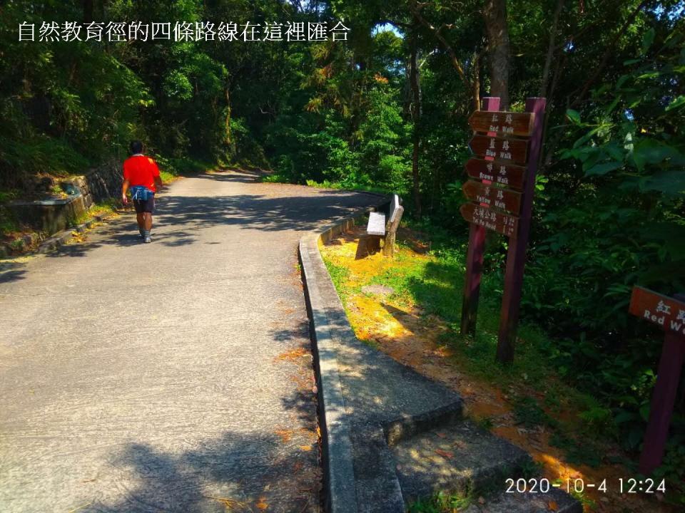 踏入自然護理區後沿車路(大埔滘林道)上行半公里到達四條路線林徑的起步點,起步點前方郊遊地點休憩處有公廁。林道沿途有不同顏色路標指引,按自己選擇的顏色行走即可。今次我們用2小時完成藍路行程。